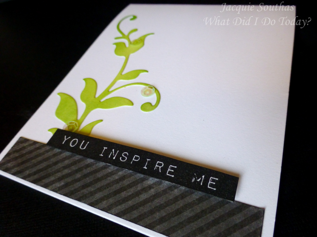The Paper Smooches sentiment is stamped before two of the panels are popped up on the card base. The Poppystamps Massa Leaf die is adhered on the card base and then the Maya Road acrylic butterfly added where the popped up panels meet. A couple of punched butterflies finish the card off.