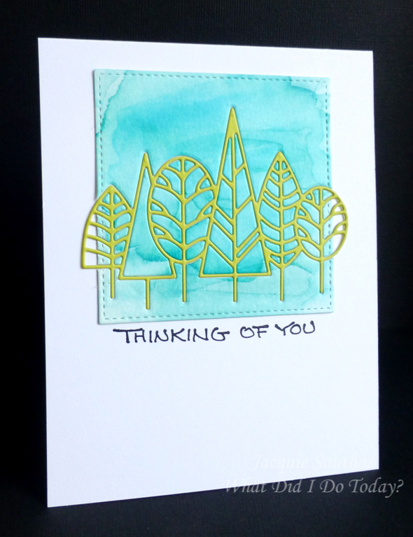 Following the sketch from CAS(E) This Sketch! #170, a white card stock panel is cut using the SSS Curved Edge die. After the first cut, washi tape held the two pieces together and a second cut was made, leaving me for four panels.