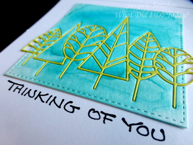 The Tim Holtz Burlap stencil was laid diagonally on a white card base and Tumbled Glass Distress Ink blended over it. The color is more intense at the point where the curved panels intersect and tapers out toward the edges.